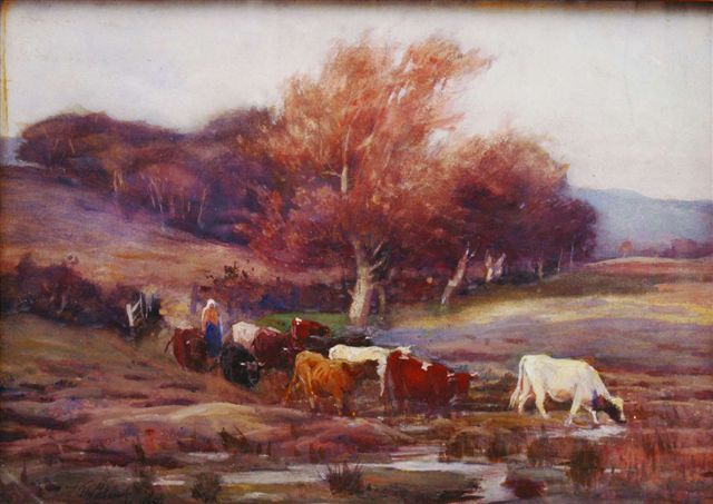 A drover and cattle crossing a stream