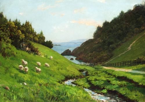 SHEEP GRAZING BY A STREAM IN SUMMER