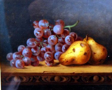still life study of pears and grapes on a carved plinth