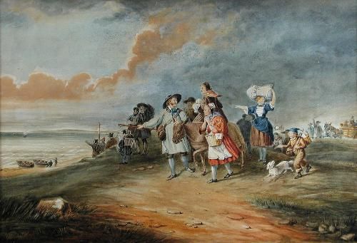 Fisherfolk on the Way to Meet Fishing Boats, with Carts and Horses Following