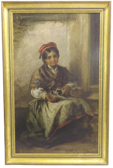 | Continental girl holding a Guinea Pig, seated on the steps to a house | |