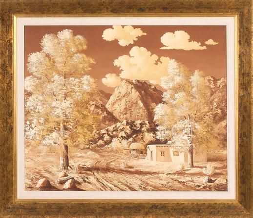 Southwestern landscape with adobe-style house in foreground