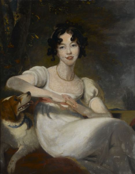 | Portrait of a young lady with her spaniel dog, with a landscape background | |