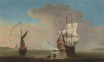 | A flagship announcing her departure from the Medway with a Royal yacht anchored nearby | |