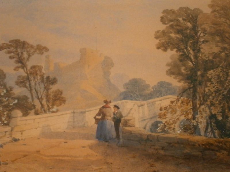 Figures on a bridge before Corfe Castle in the distance