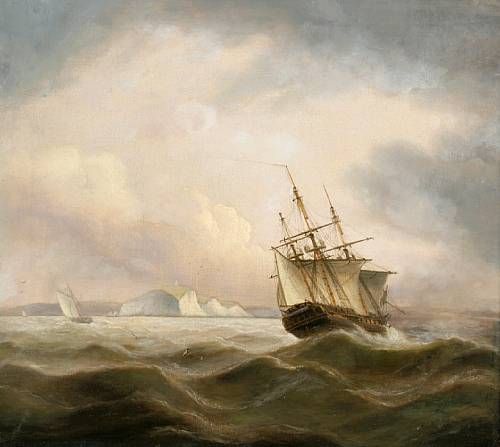 | A British frigate off the White Cliffs of Dover under shortened sail in a large swell | |