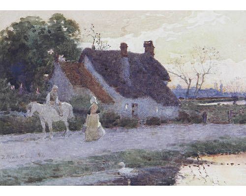 Figures by a cottage at sunset