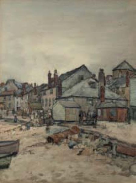 | St Ives; a view of fishermen’s cottages with the beach and boats in the foreground | |