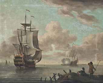 | A man-o'war getting underway from its anchorage, with another saluting offshore | |
