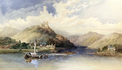 | Continental river landscape with hilltop village and mountains, and boats to foreground | |
