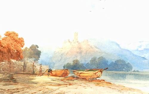 Boats on a shore, with a castle beyond
