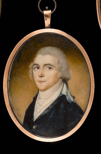 | A Gentleman, wearing blue coat, white waistcoat, frilled chemise and white stock, his hair powdered and worn en queue | |
