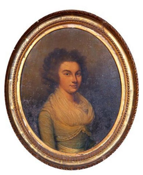 An oval half length portrait of a lady wearing a lace trimmed dress
