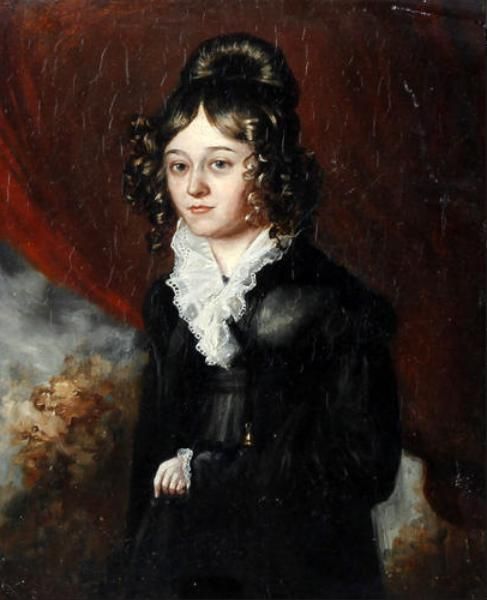 Portrait of a lady wearing a black dress with a white lace collar, and her hair in ringlets