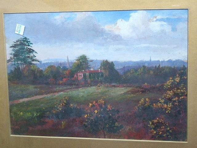 | View of a village across a common, bears initials, bears inscription on reverse | |