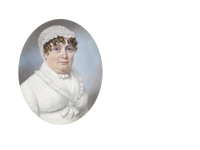 | A Lady called, Hannah Pemberton, wearing white dress with frilled lace collar and matching white lace bonnet. | |