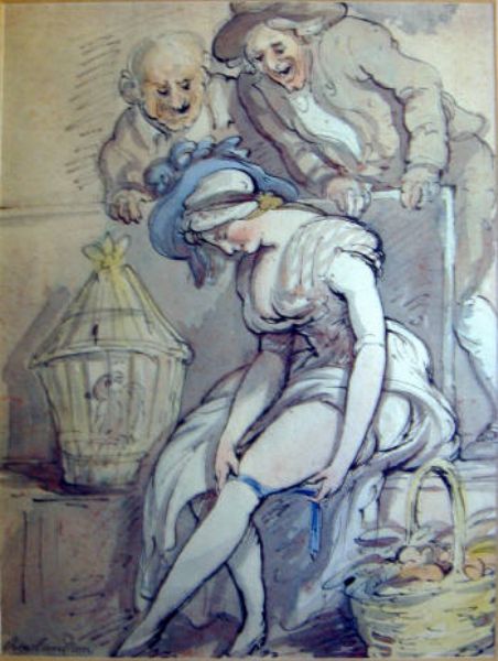 Scene with girl fastening her garter viewed by two lecherous old goats