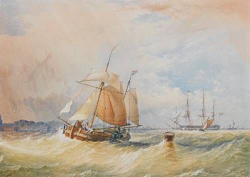 A Dutch hoy running inshore with frigates anchored in the roadstead beyond