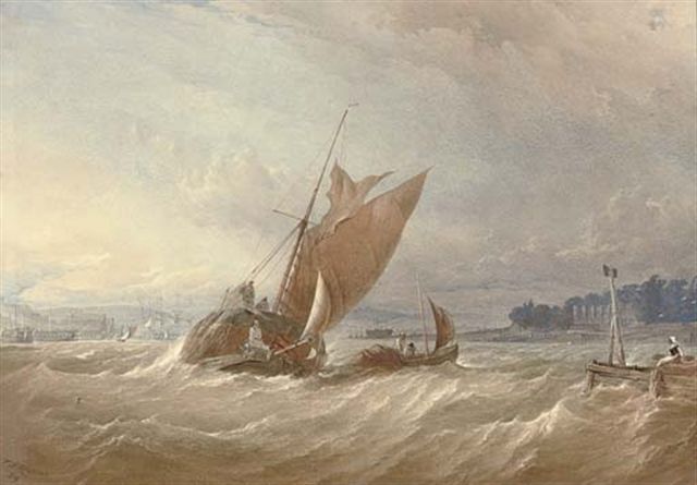 | A hay barge running out of the Medway with Upnor Castle abeam | |