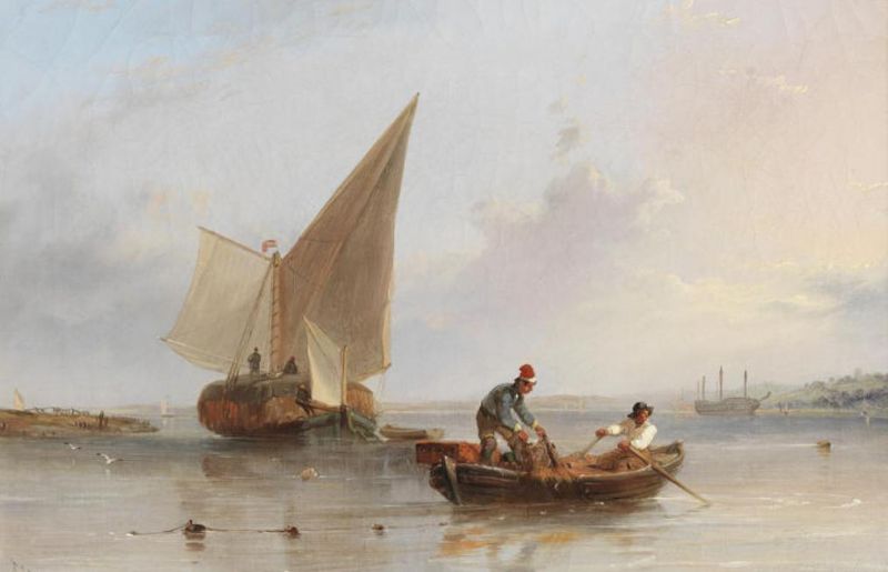 | A lazy afternoon on an estuary, with a heavily-laden hay barge trying to catch the breeze and some old hulks laid-up beyond | |