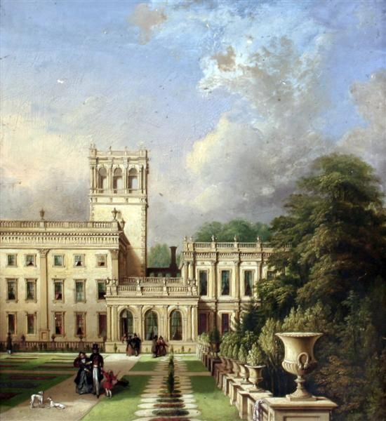 | View of Trentham Hall - figures walking in the gardens | |