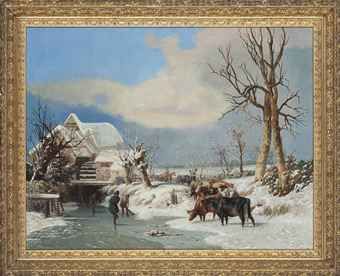 | Ice-skating figures on a frozen river, by a mill, with cattle in the foreground | |