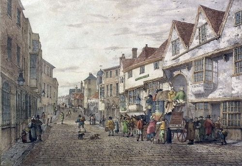 | High Street, Canterbury, showing stage coach outside The George and Dragon Inn | |
