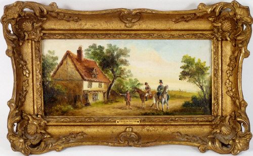 | A MAN AND WOMAN ON HORSEBACK IN CONVERSATION WITH A MAN BY A WAYSIDE COTTAGE | |