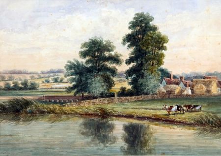 | East Anglian Landscape with Cattle Grazing by a River, Steam Train to Distance | |