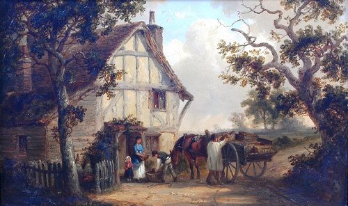 Figures before a timbered cottage with horse and cart