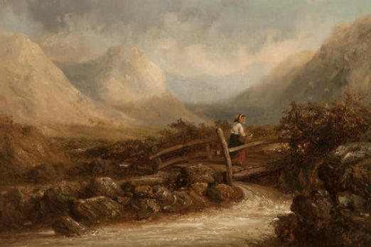Girl crossing a bridge in a Highland landscape