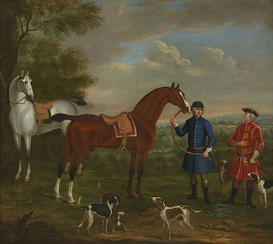 A BAY AND A GREY HUNTER IN A LANDSCAPE