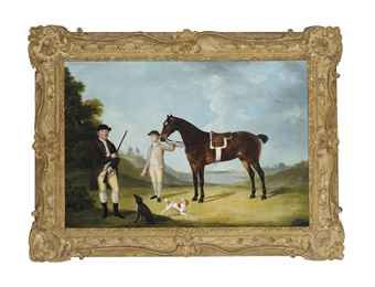 | A gentleman and his hounds in an extensive landscape, his groom holding the reins of his chestnut hunter | |