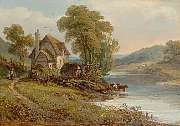 Figures by a cottage in a river landscape, cattle watering nearby