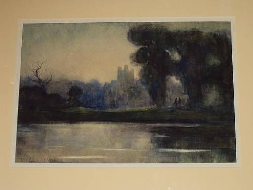 River scene with abbey ruins and figures on the river bank