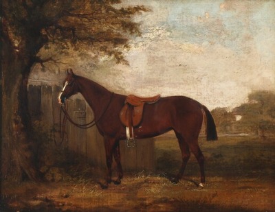 A saddled horse tethered to a fence