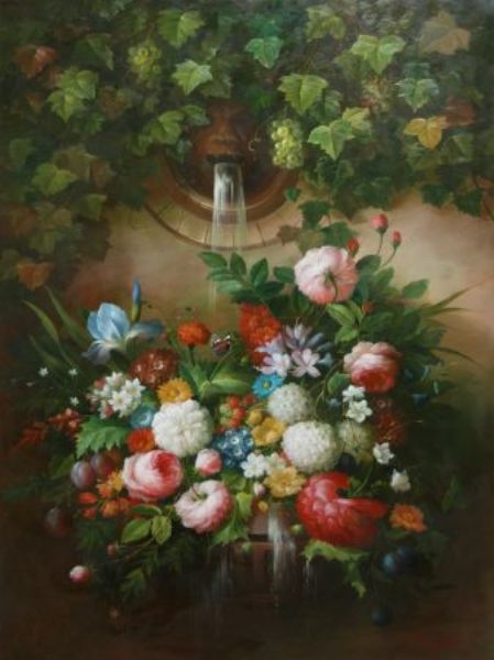 Still Life Study of Mixed Flowers in a Vase by a Fountain