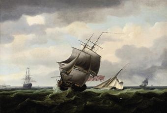 | A Royal Naval frigate running down the Channel with a cutter shortening sail off her stern and a large man-o'war anchored off th | |