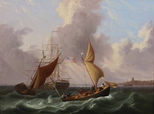 | An U.S. three-masted vessel, a smalschip and a pilot boat off the Dutch coast | |