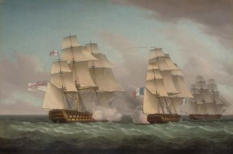 | H.M.S Venerable exchanging fire with the French frigate Alcmène prior to capturing her off the Canary Islands on 16th January 18 | |