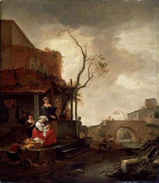 | A VILLAGE SCENE WITH WOMEN SEWING AND A BOY PEELING VEGETABLES AT THE ENTRANCE TO A COTTAGE, DROVERS CROSSING A BRIDGE BEYOND | |
