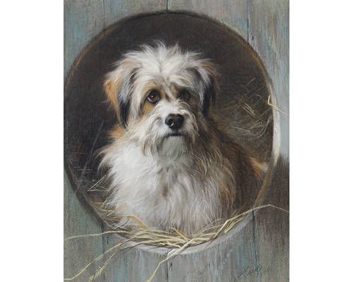 A terrier looking out of his kennel