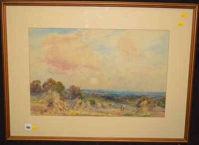 Thomas William Morley - ''The Lingering Gleam, The Weald, Nr. Sevenoaks'' - figures in a cornfield, signed, watercolour, 34.5 x 52.5cms; 13 1/2 x 20 3/4in. | |