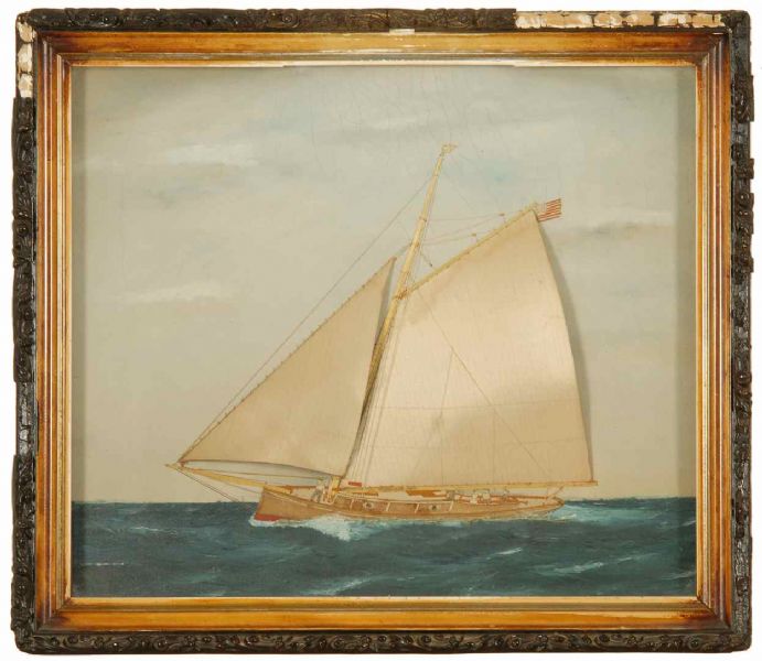 Catboat off a coast.