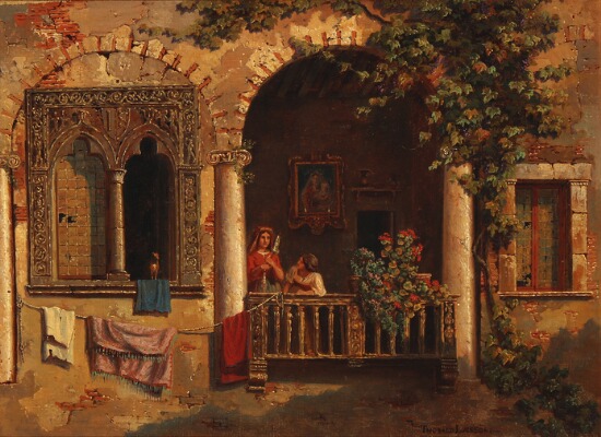 Two Italian women looking out from a balcony