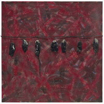 Enamel wire, cloth, enamel, and mixed media on canvas laid down on board