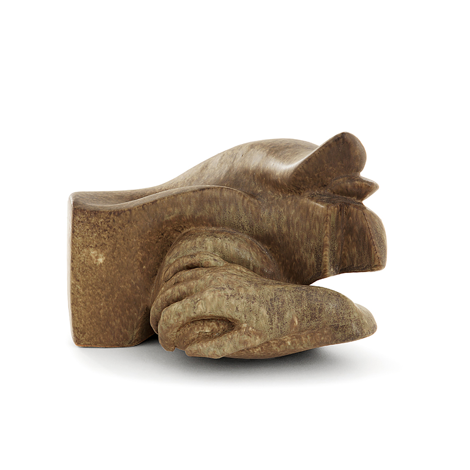 | Sculpture en porcelaine stylisant des flammes et une main, émaux jaspés beiges, verts, ocre et bruns | |