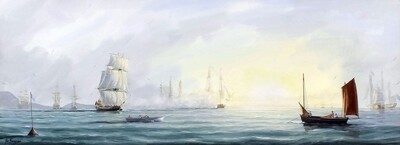 | Marine scene with masted vessels and fishing boat to foreground | |