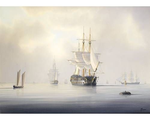| Two-deckers drying their sails at anchor in Spithead, with other ships of the fleet beyond | |