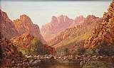 | Solbelyst bergslandskap, i förgrunden vattendrag. Motiv från Sydafrika | |
